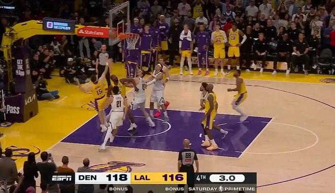 最後5.3秒,裏夫斯執行第二罰,此時湖人116-118掘金,如果罰中,意味著湖人落後1分,掘金手握球權,雙方將陷入凶險未卜的點球大戰。