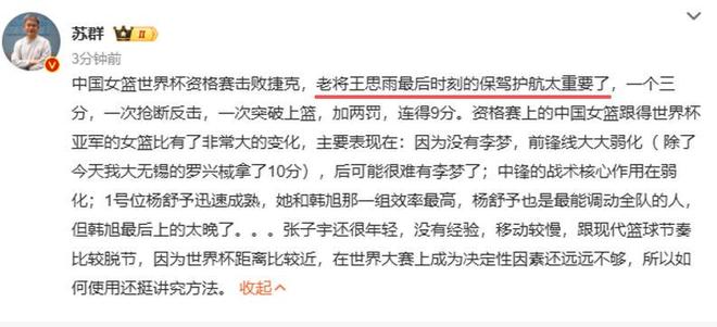 王思雨末節9分,充分展現了自己的能力,名嘴蘇群大誇:老將王思雨最後時刻的保駕護航太重要了。全場7投5中,還有3次助攻,再次拿到全隊最高的14分,不得不說美女王思雨是中國隊最大的功臣。上一場與南蘇丹的比賽,也是王思雨砍下全隊最高的17分,她是這次世預賽貢獻最大的隊員。