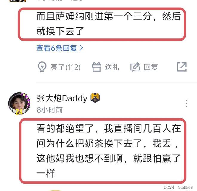 誰打得好換誰下,杜鋒的臨場調整,讓粵迷們大惑不解,紛紛吐槽道“不是你的問題嗎,你到底要怎麽樣才能下課,追到9分就把奶茶換下去,你到底在幹什麽?”;“而且薩姆納剛進第一個三分,然後就換下去了”;“看的都絕望了,我直播間幾百人在問為什麽把奶茶換下去了,我丟 ,這他媽我也想不到啊,就跟怕贏了一樣。”。