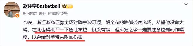 記者趙環宇也怒批魯吐布拉,“浙江浙商證券主場對陣寧波町渥,胡金秋的胳膊受傷離場,希望他沒有大礙。在此也得批評魯吐布拉,“拚沒有錯,但拚搏之餘一定要注意控製動作幅度,以免給對手帶來附加傷害。”