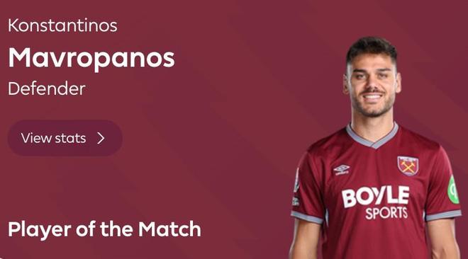 頭球破門+10次解圍,馬夫羅帕諾斯當選西漢姆1-1曼城全場最佳