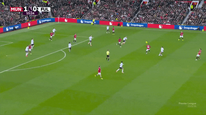 此處,庫尼亞向內切,費爾南德斯向邊線移動,曼聯從右路進攻。隨後阿馬德重新組織攻勢,暫時扮演起“10號位”(中路組織者)的角色,將姆伯莫換位到左側。