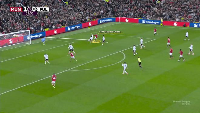 當達洛特尋找傳球選擇時,費爾南德斯的站位牽製了富勒姆的左後衛安東尼-羅賓遜,為庫尼亞創造了空間,而昆卡未能跟住他。