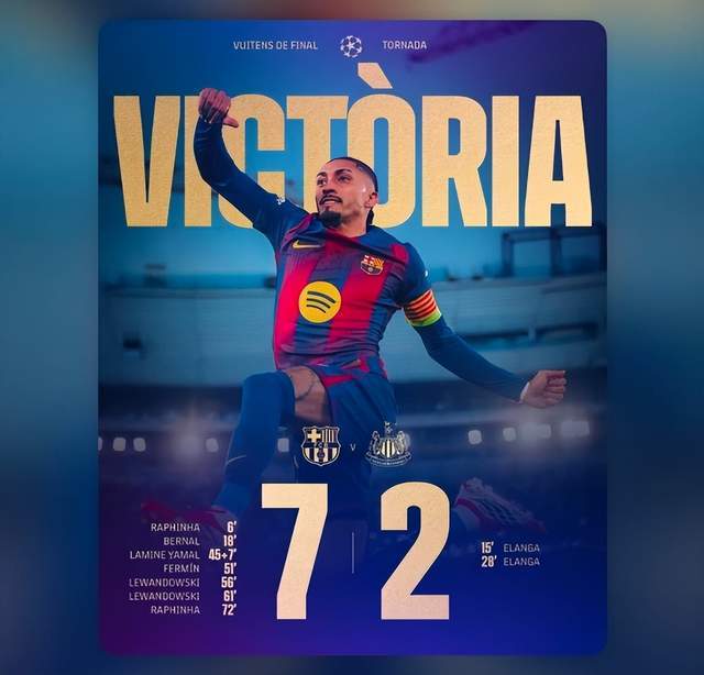 歐冠1/8決賽次回合,巴薩在諾坎普球場7-2大勝紐卡,總比分8-3淘汰喜鵲,殺進歐冠8強。拉菲尼亞獨造5球,萊萬梅開二度,亞馬爾也有進球。巴薩球員、球迷享受勝利的同時,俱樂部也賺到巨額獎金。