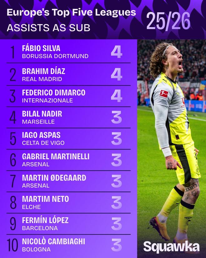 據統計,法比奧-席爾瓦、卜拉欣-迪亞斯和迪馬爾科是本賽季歐洲五大聯賽作為替補送出助攻並列最多的球員。