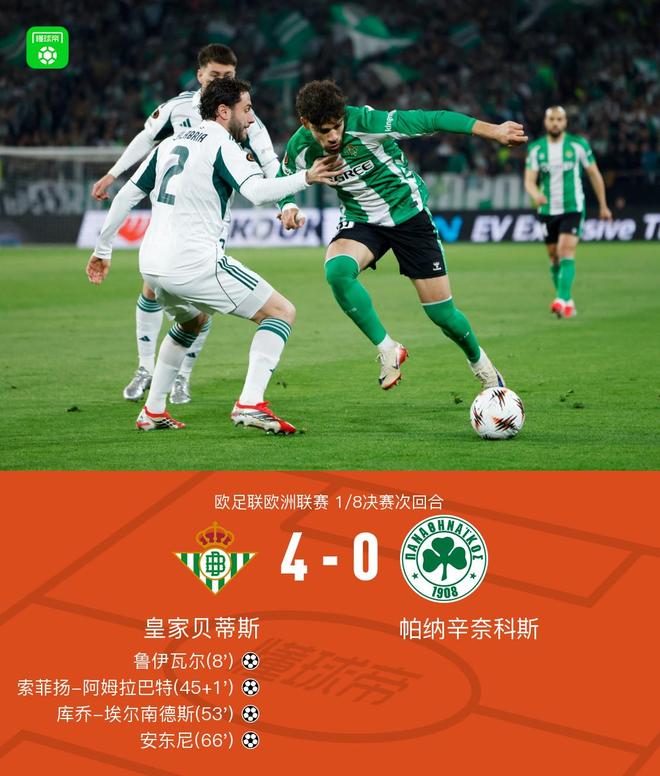 北京時間3月20日歐足聯歐洲聯賽 1/8決賽次回合,皇家貝蒂斯對陣帕納辛奈科斯。皇家貝蒂斯魯伊瓦爾破門,索菲揚-阿姆拉巴特破門,庫喬-埃爾南德斯破門,安東尼破門。最終比分皇家貝蒂斯 4-0 帕納辛奈科斯。兩回合總比分皇家貝蒂斯4-1帕納辛奈科斯。